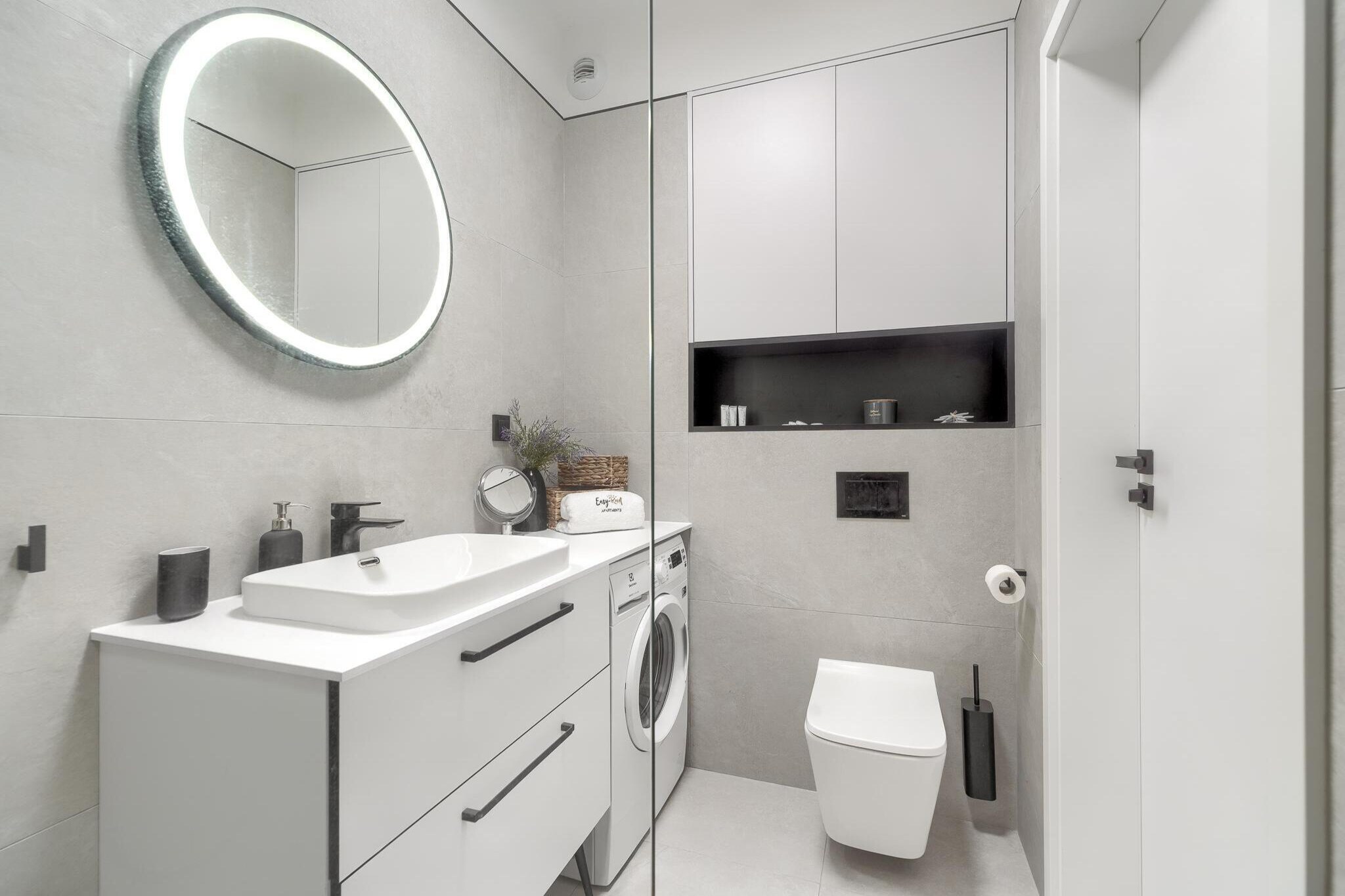 Parterre: (offene Küche(Kochplatte(4 Kochplatten, Induktion), Wasserkocher, Toaster, Dunstabzugshaube, Kaffeemaschine, Backofen, Mikrowelle, Spülmaschine, Kühl-/Gefrierkombination), Wohn/Esszimmer(Doppelschlafcouch, TV(Flatscreen), Esstisch(4 Personen)), Schlafzimmer(Doppelbett), Badezimmer(Dusche, Waschbecken, Toilette, Waschmaschine, Föhn))