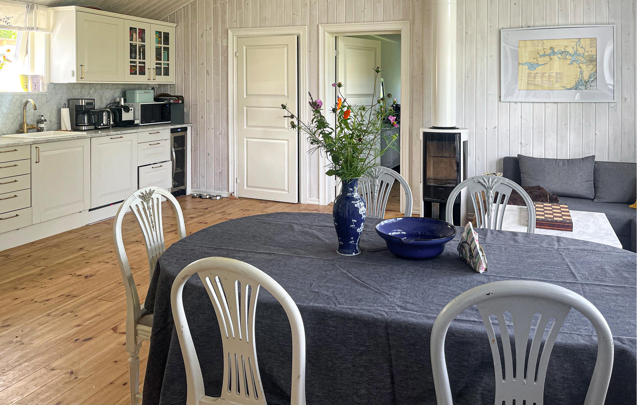 Machen Sie es sich im hellen Wohnbereich auf dem gemütlichen Sofa vor den großen Fenstern bequem. Der Raum wirkt durch die Holzwände freundlich und strahlt eine nordische Leichtigkeit aus. Nutzen Sie den modernen Kaminofen, um den Raum an kühleren Tagen mit wohliger Wärme zu füllen. Bereiten Sie in der praktisch gestalteten Küche Ihre Mahlzeiten zu und genießen Sie anschließend eine entspannte Pause, bevor Sie die Sauna mit ihrer wohltuenden Wirkung nutzen.