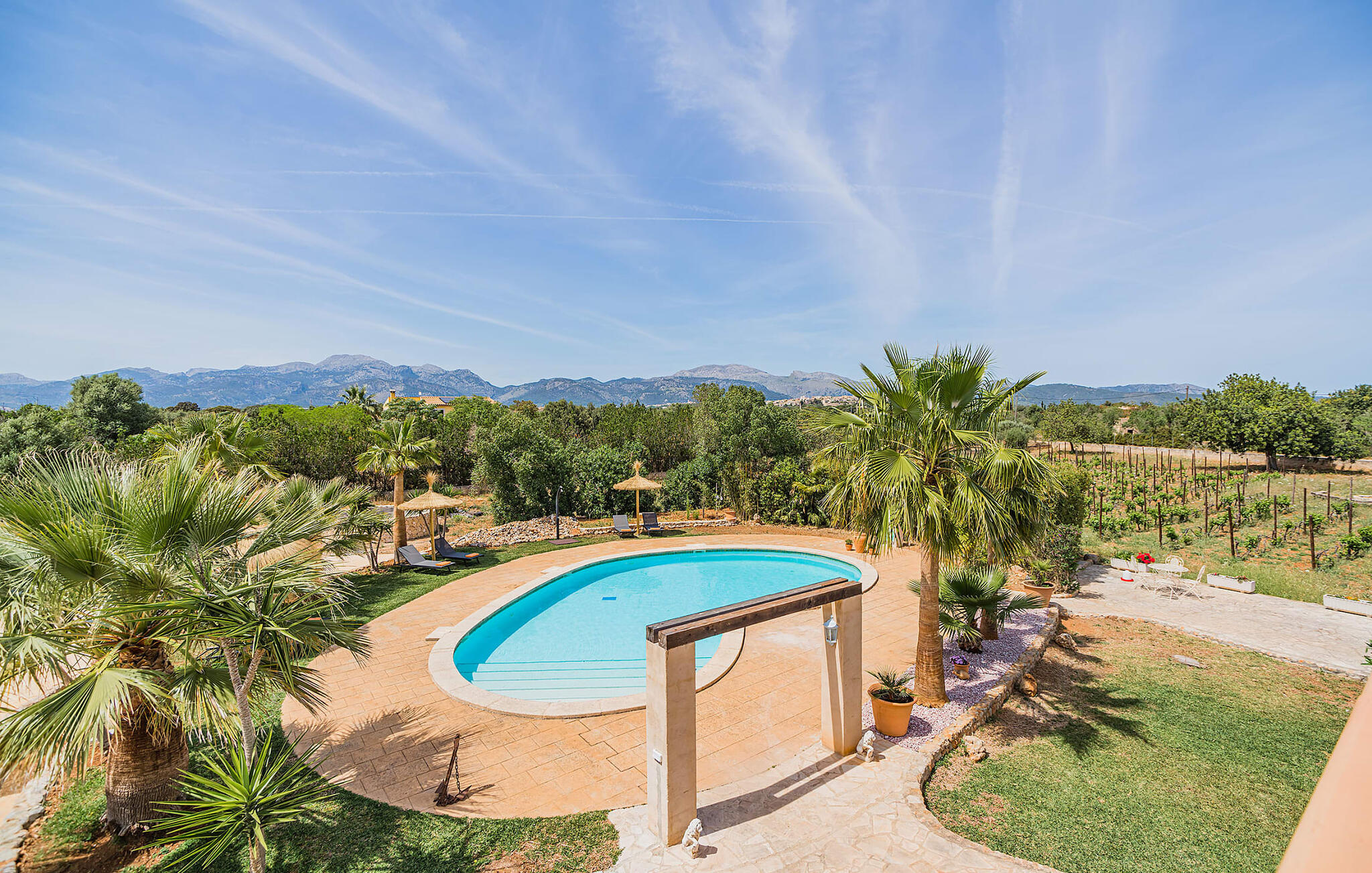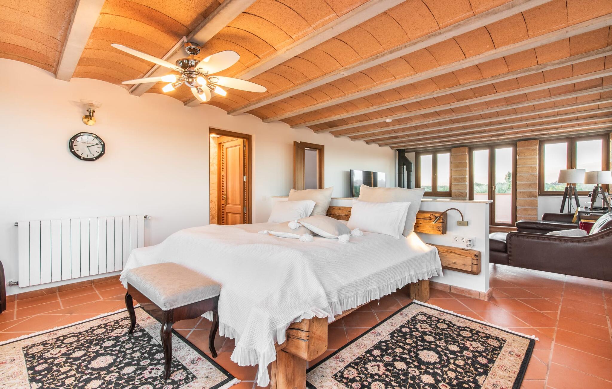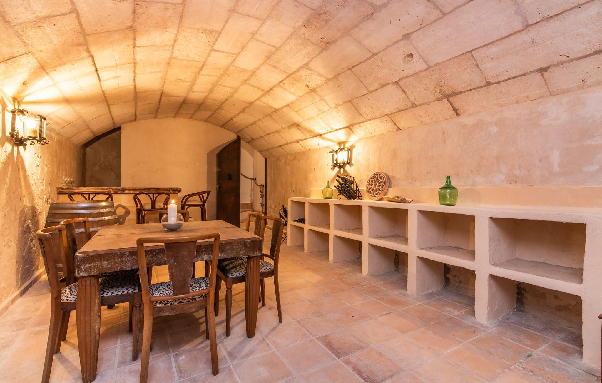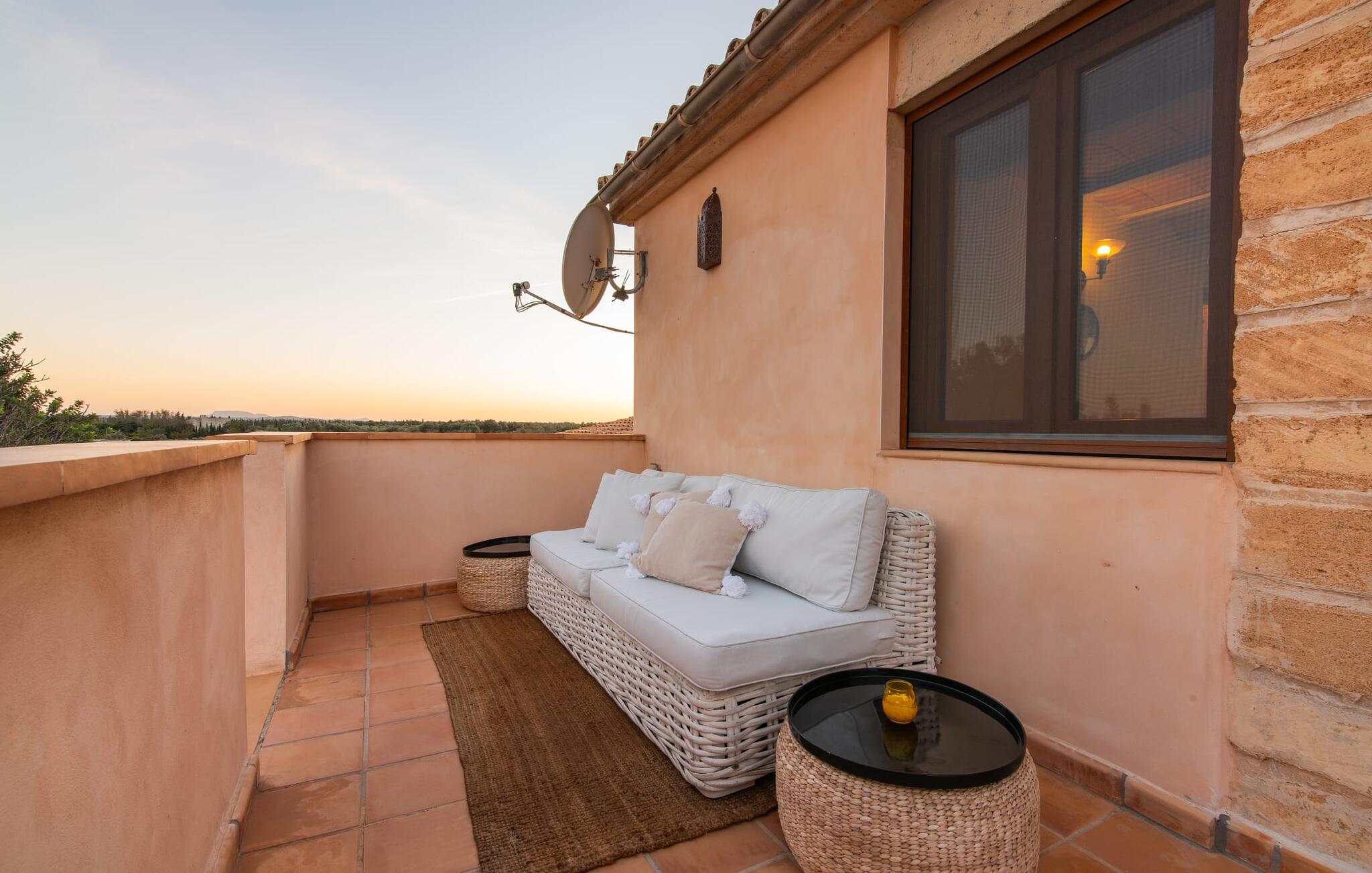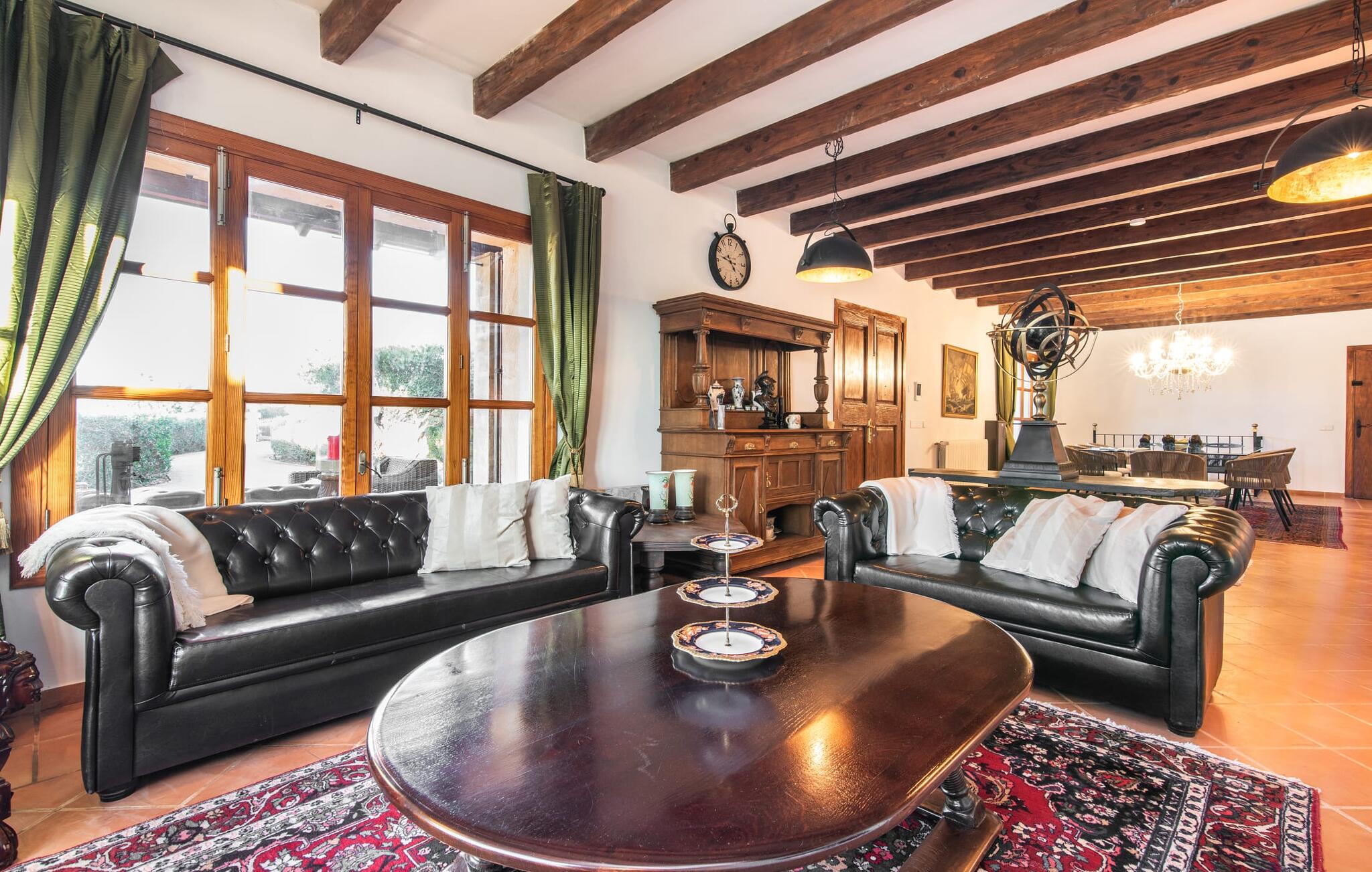 Im Inneren präsentiert sich der Hauptwohnbereich mit hochwertigen, teilweise antiken Möbeln und großen Fenstern mit Blick auf den Pool. Im Erdgeschoss befinden sich zwei Doppelzimmer mit eigenem Bad, ein Kinderschlafbereich und eine Gästetoilette. Im Obergeschoss befindet sich eine luxuriöse Master-Suite mit privatem Wohnzimmer, eigenem Bad und Zugang zu den Dachterrassen, die einen atemberaubenden Blick auf die Weinberge und das Tramuntana-Gebirge bieten.