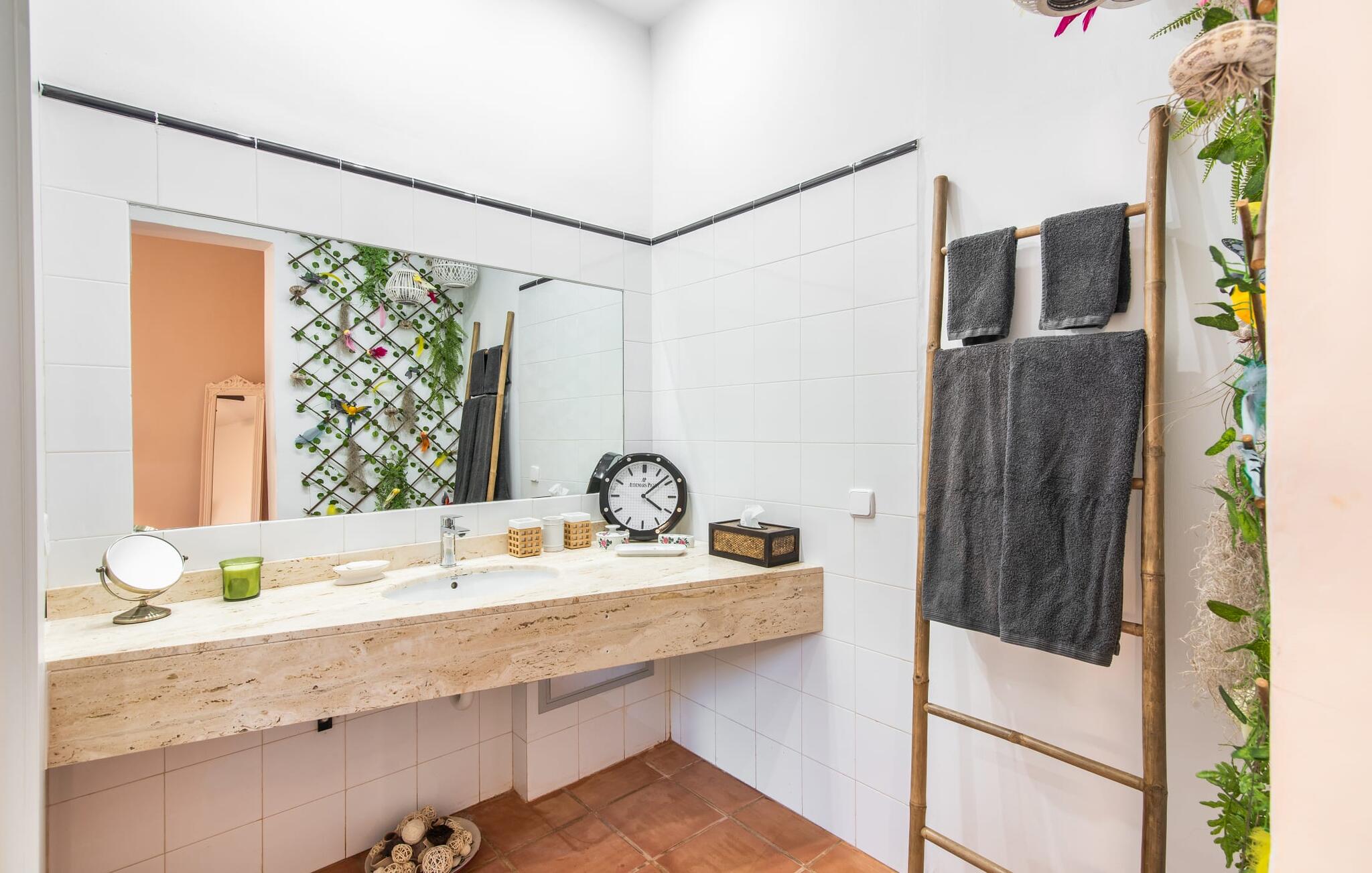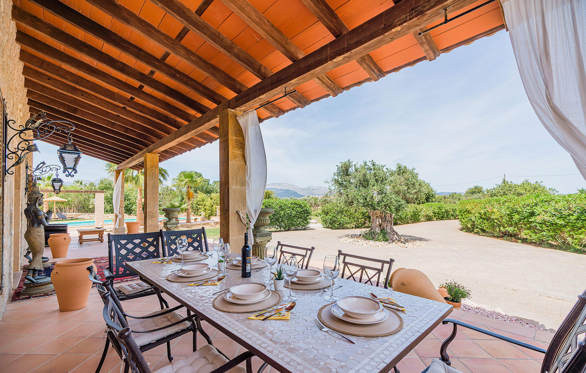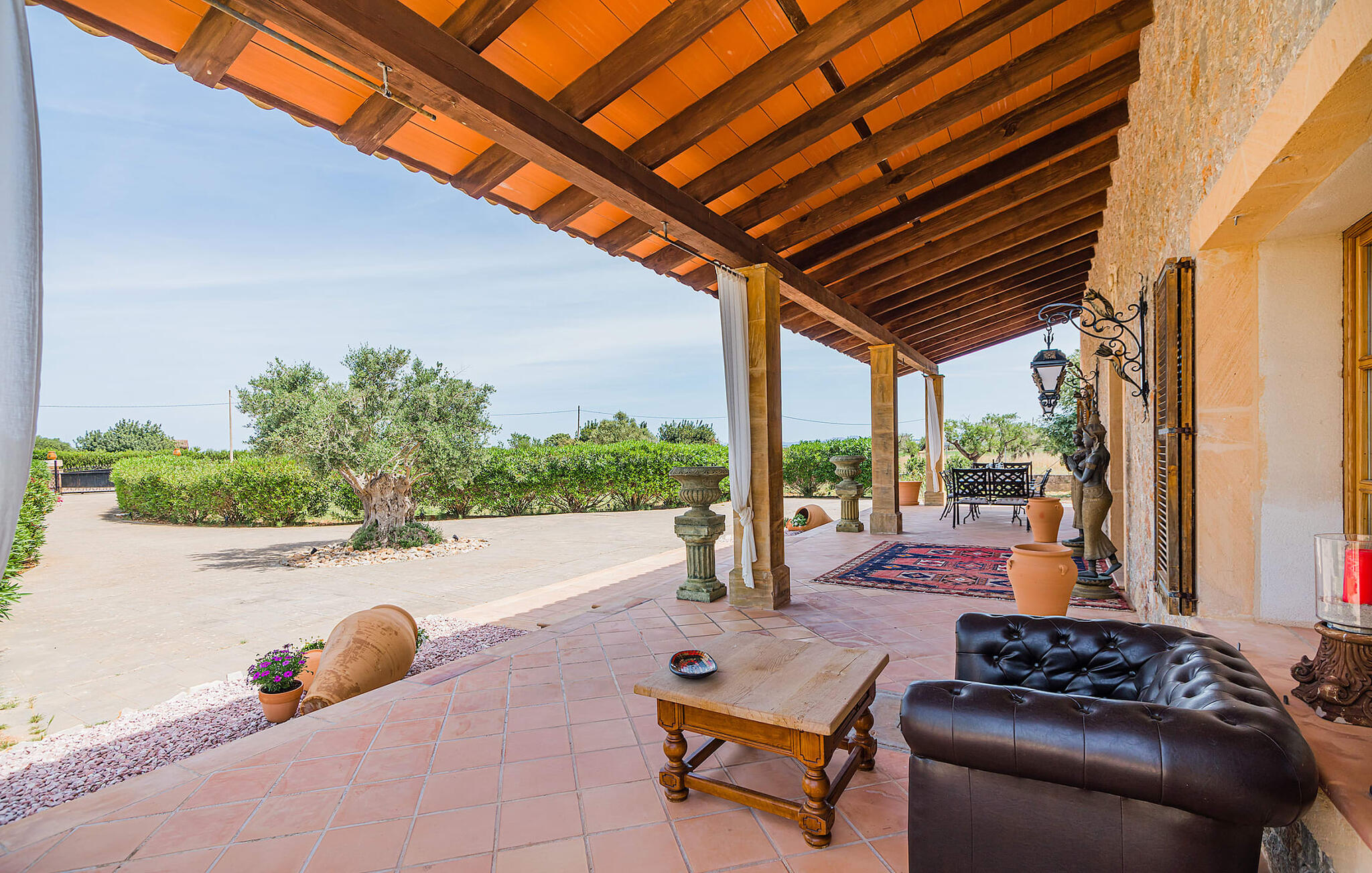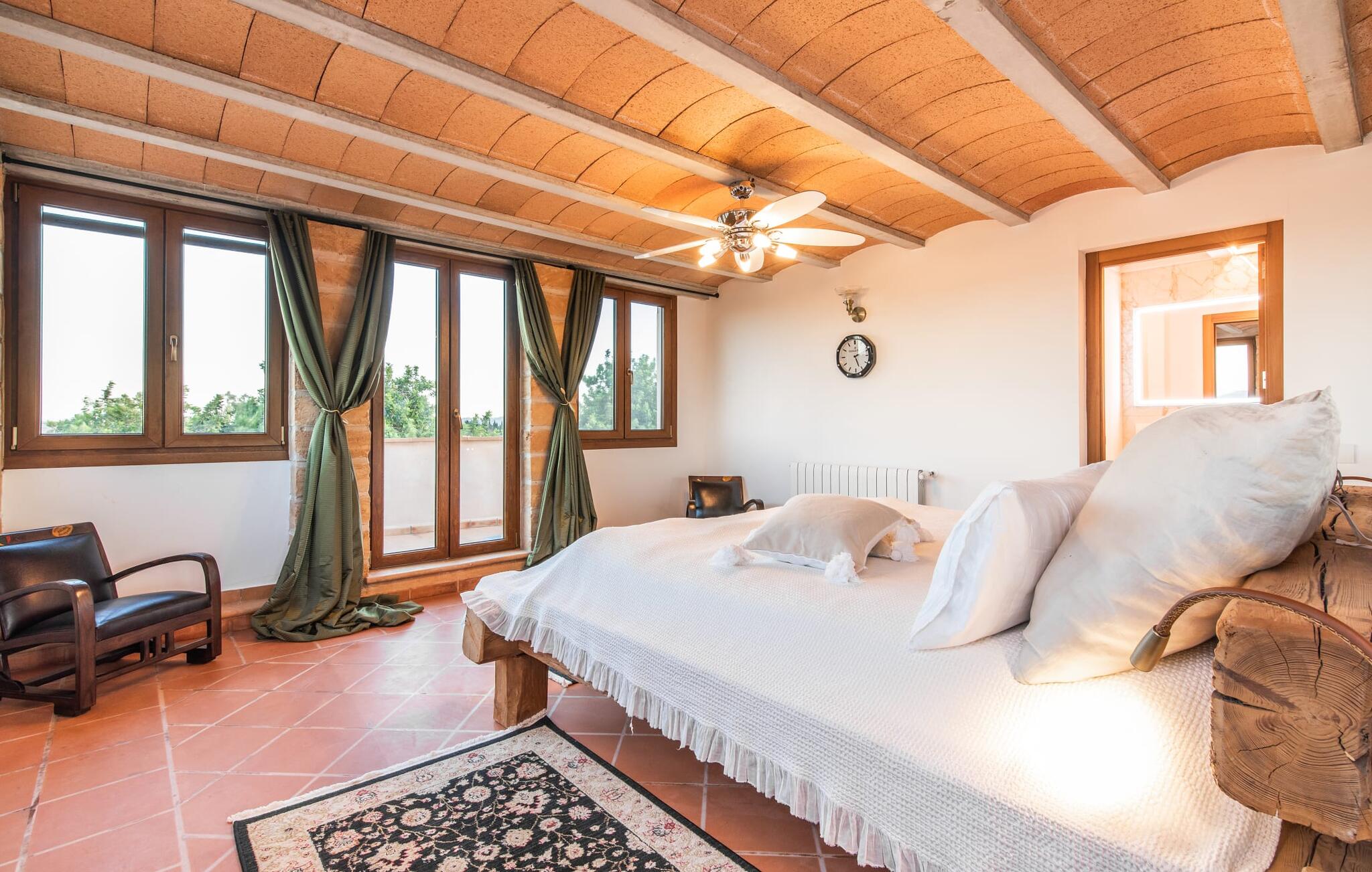 Im Inneren präsentiert sich der Hauptwohnbereich mit hochwertigen, teilweise antiken Möbeln und großen Fenstern mit Blick auf den Pool. Im Erdgeschoss befinden sich zwei Doppelzimmer mit eigenem Bad, ein Kinderschlafbereich und eine Gästetoilette. Im Obergeschoss befindet sich eine luxuriöse Master-Suite mit privatem Wohnzimmer, eigenem Bad und Zugang zu den Dachterrassen, die einen atemberaubenden Blick auf die Weinberge und das Tramuntana-Gebirge bieten.