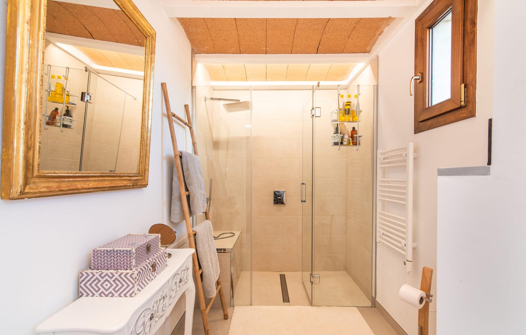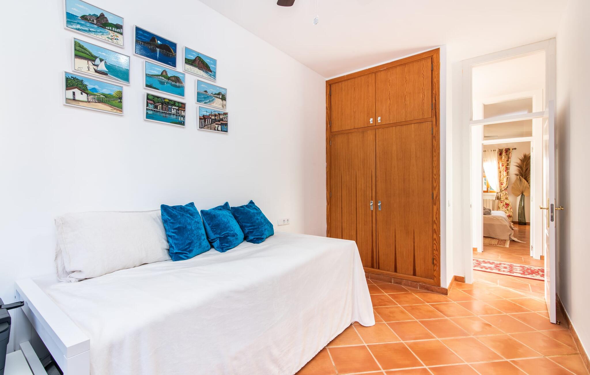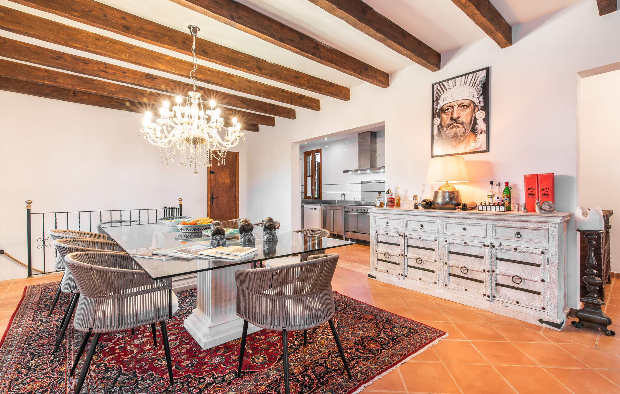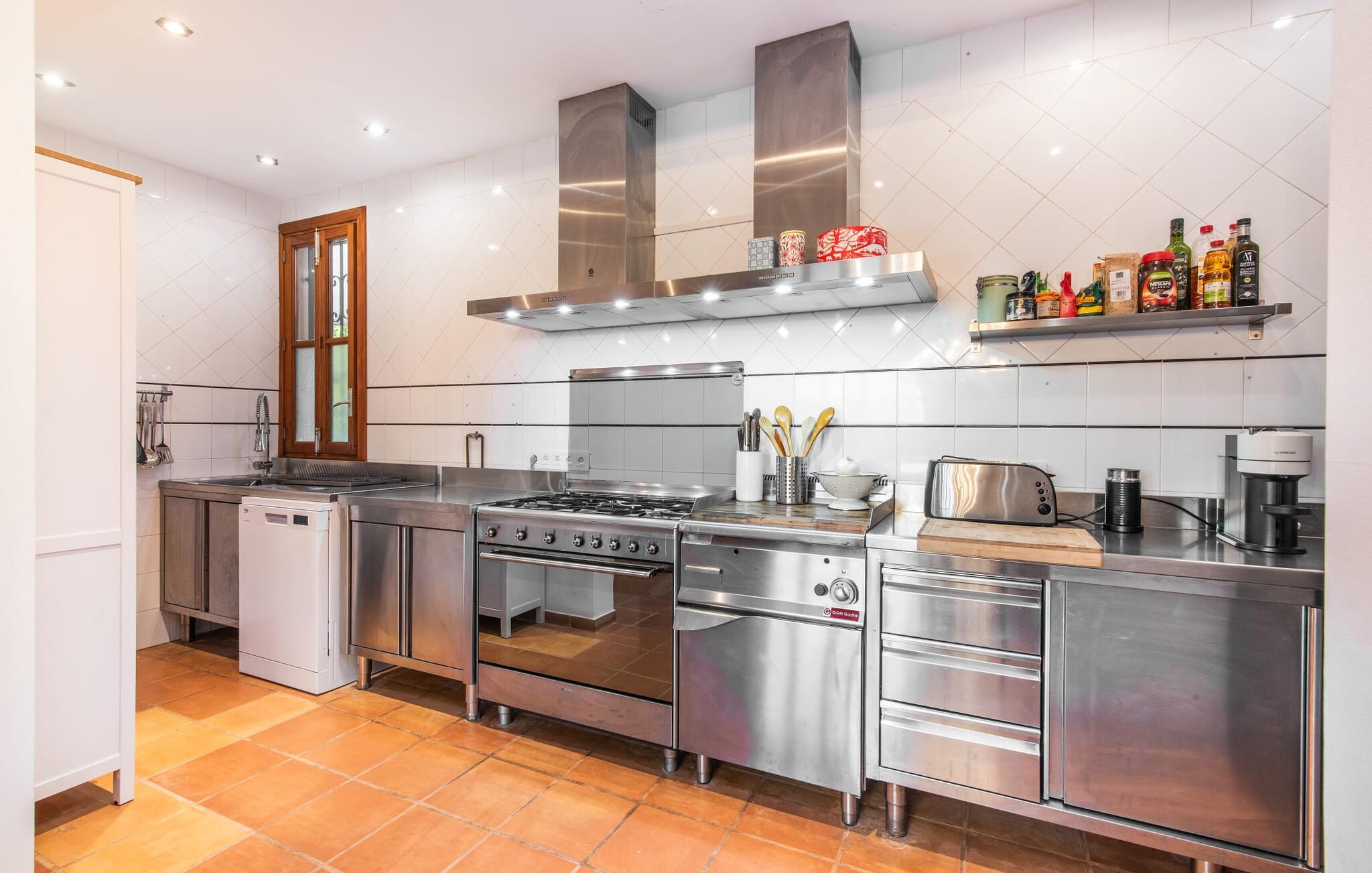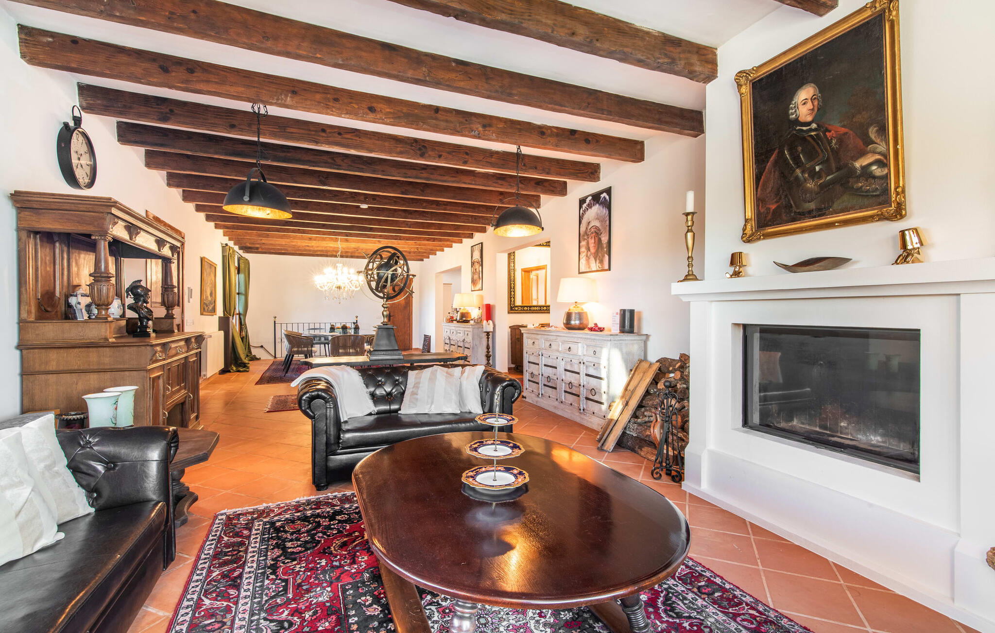Im Inneren präsentiert sich der Hauptwohnbereich mit hochwertigen, teilweise antiken Möbeln und großen Fenstern mit Blick auf den Pool. Im Erdgeschoss befinden sich zwei Doppelzimmer mit eigenem Bad, ein Kinderschlafbereich und eine Gästetoilette. Im Obergeschoss befindet sich eine luxuriöse Master-Suite mit privatem Wohnzimmer, eigenem Bad und Zugang zu den Dachterrassen, die einen atemberaubenden Blick auf die Weinberge und das Tramuntana-Gebirge bieten.