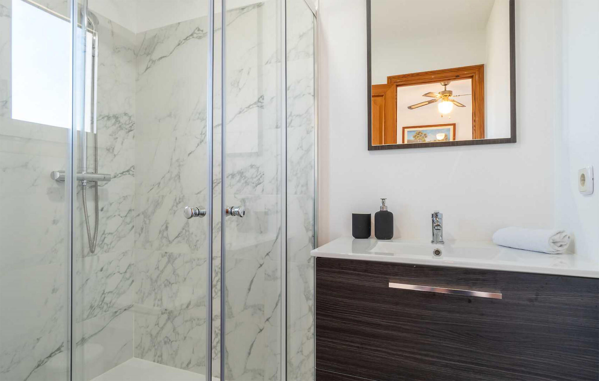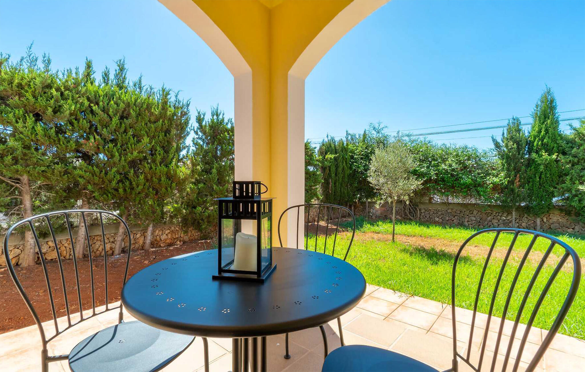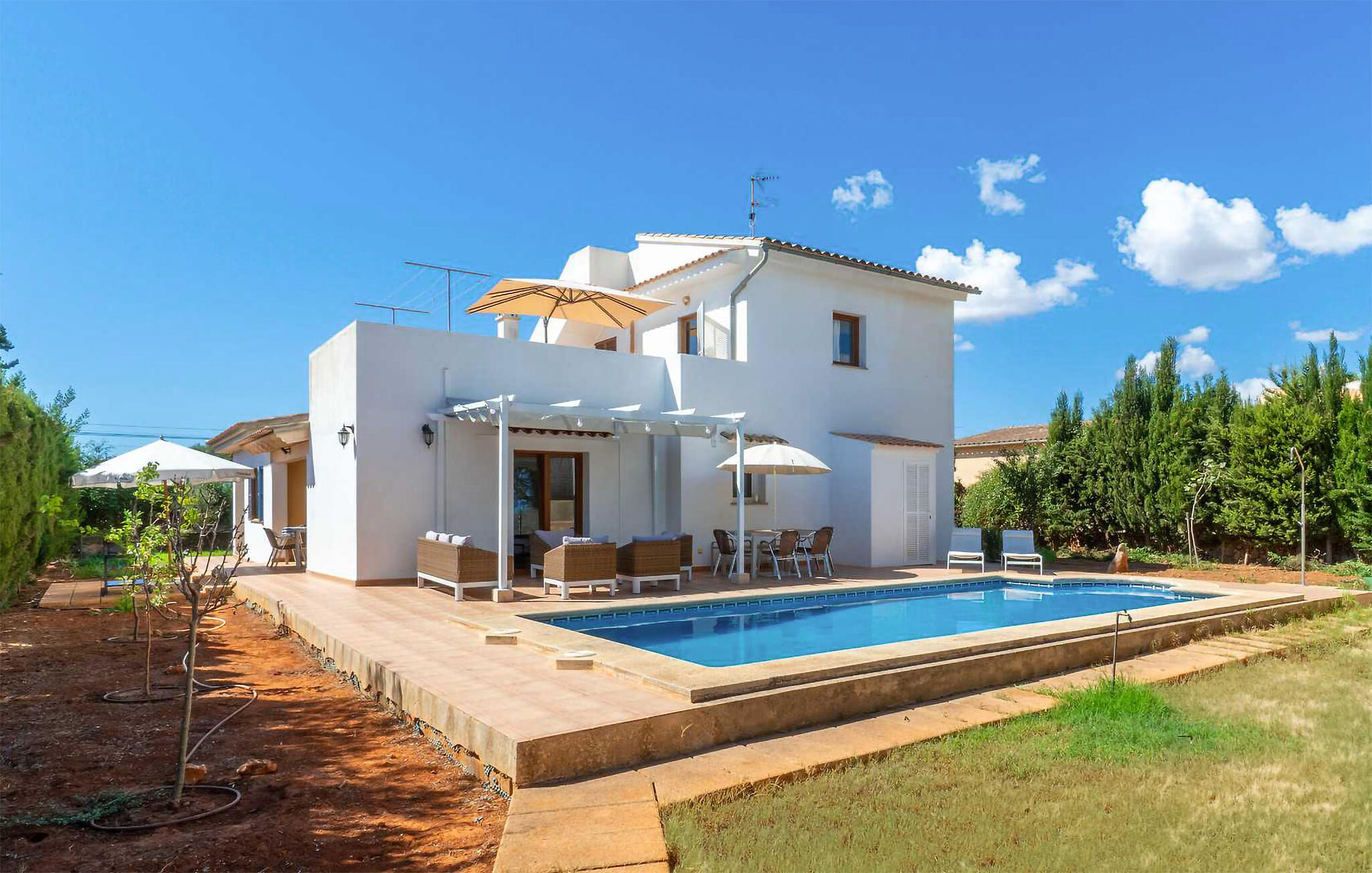 Der Außenbereich ist wie geschaffen für lange Sonnenstunden unter dem stahlblauen Himmel. Starten Sie mit frisch gepresstem Orangensaft auf der Terrasse in den Tag, erfrischen Sie sich im herrlichen Pool und plaudern Sie bei einem mallorquinischen Wein in der gemütlichen Lounge. Auch die Dachterrasse ist mit bequemen Sonnenliegen bestückt – hier können Sie im Sommer nach einem stimmungsvollen Grillfest Sternschnuppen zählen.