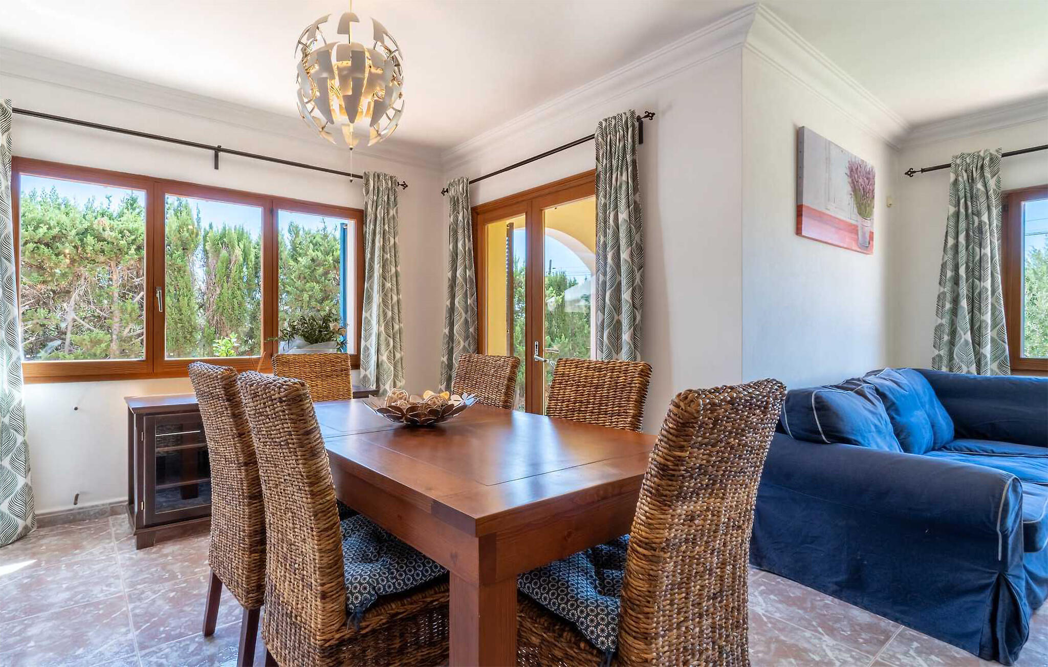 Diese großzügige und komfortable Villa heißt Sie in einem gepflegten Wohngebiet unweit des malerischen Hafenorts Portocolom an Mallorcas Südostküste willkommen. Das helle und behagliche Interieur bietet reichlich Platz für gemeinsame Stunden mit Freunden oder der Familie. Verwandeln Sie in der geräumigen Küche in geselliger Runde frische Produkte vom Markt in köstliche Gerichte und nehmen Sie am einladenden Esstisch Platz. Nach einem langen Tag können Sie es sich für einen Spieleabend oder mit einem guten Buch auf dem Sofa bequem machen.